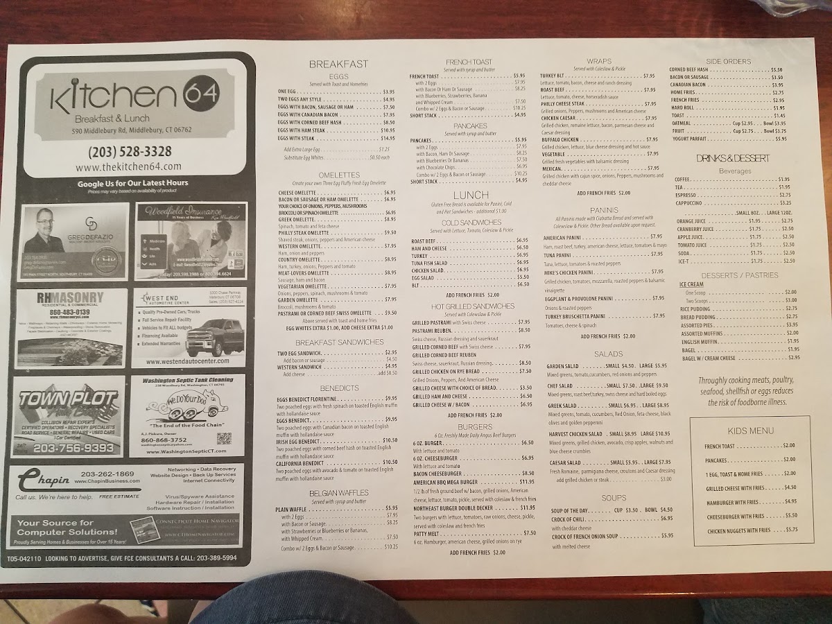 Welcome to Kitchen 64, a delightful culinary gem located at 590 Middlebury Rd, Middlebury, CT. This inviting eatery boasts an eclectic decor that enhances its homey atmosphere, making it a perfect spot for brunch or a casual meal.